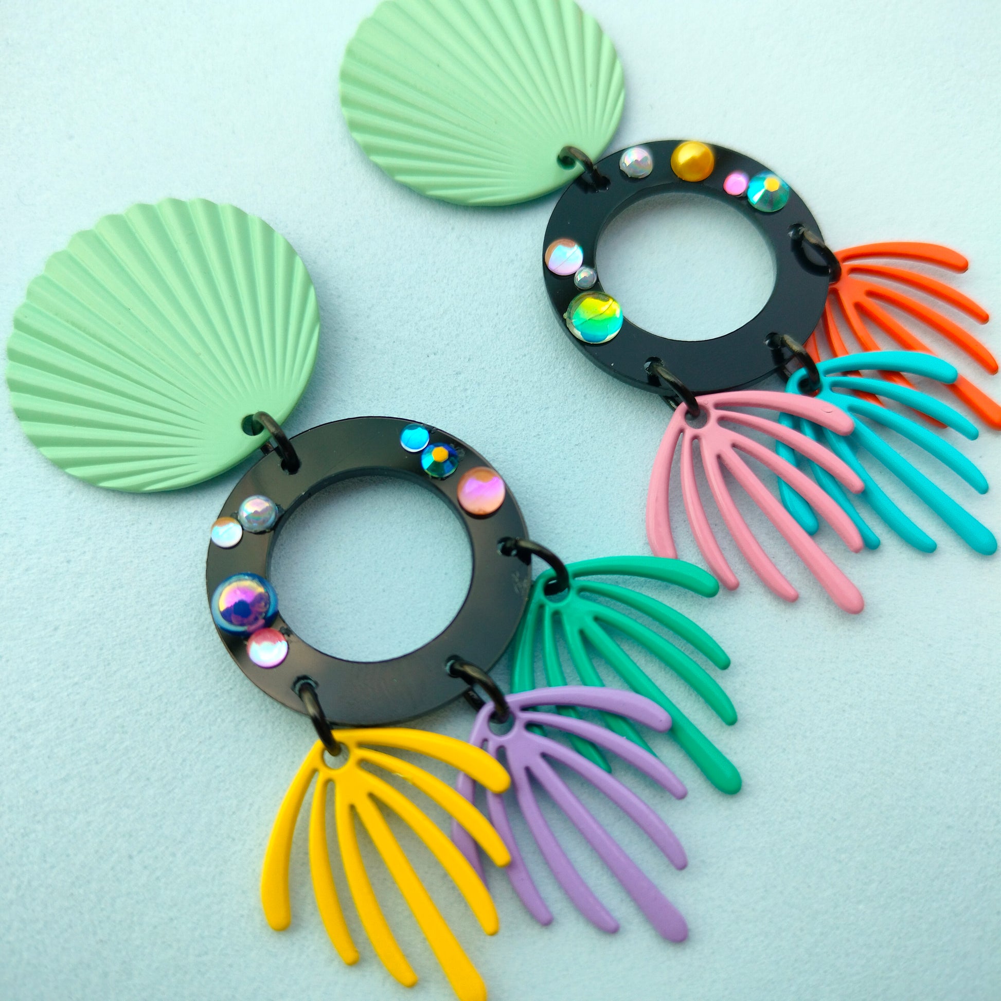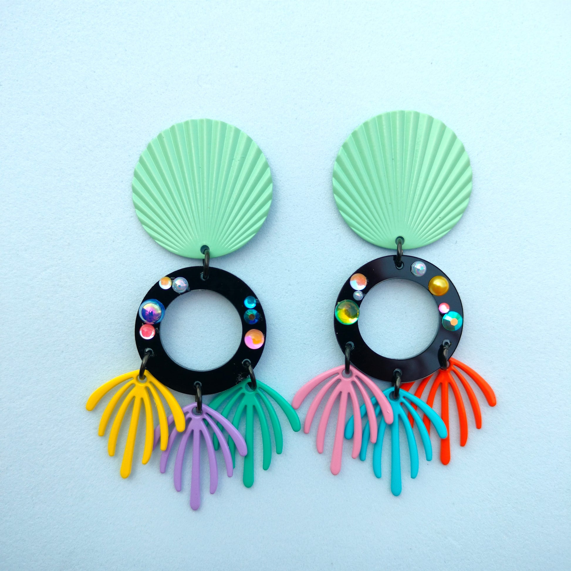 Pendientes de latón esmaltado, plexy, acetato y aleación de zinc esmaltado. Perno de acero inoxidable (hipoalergénico).