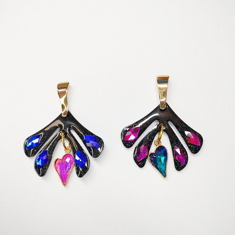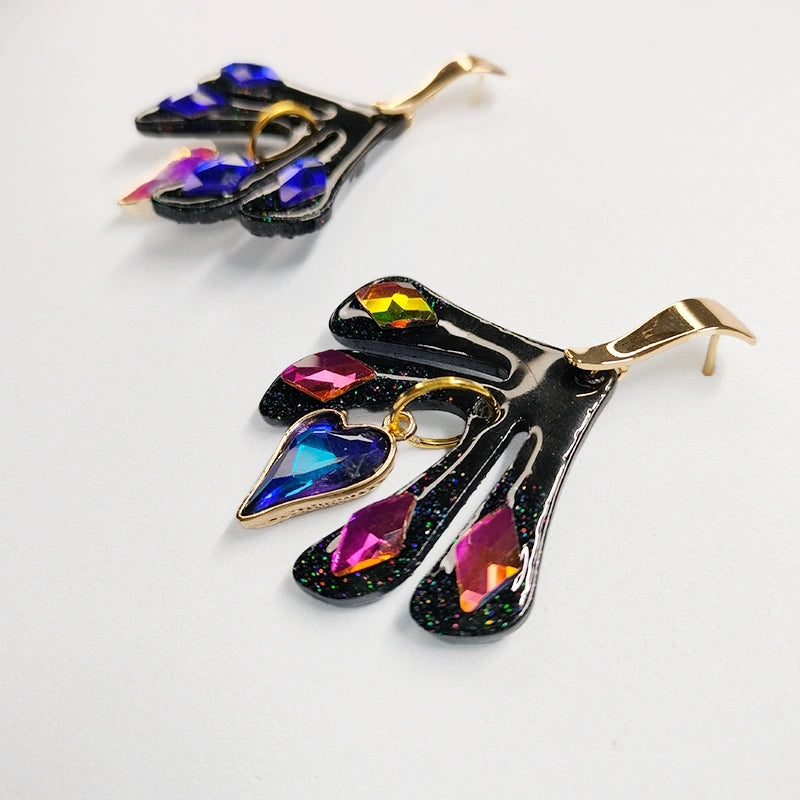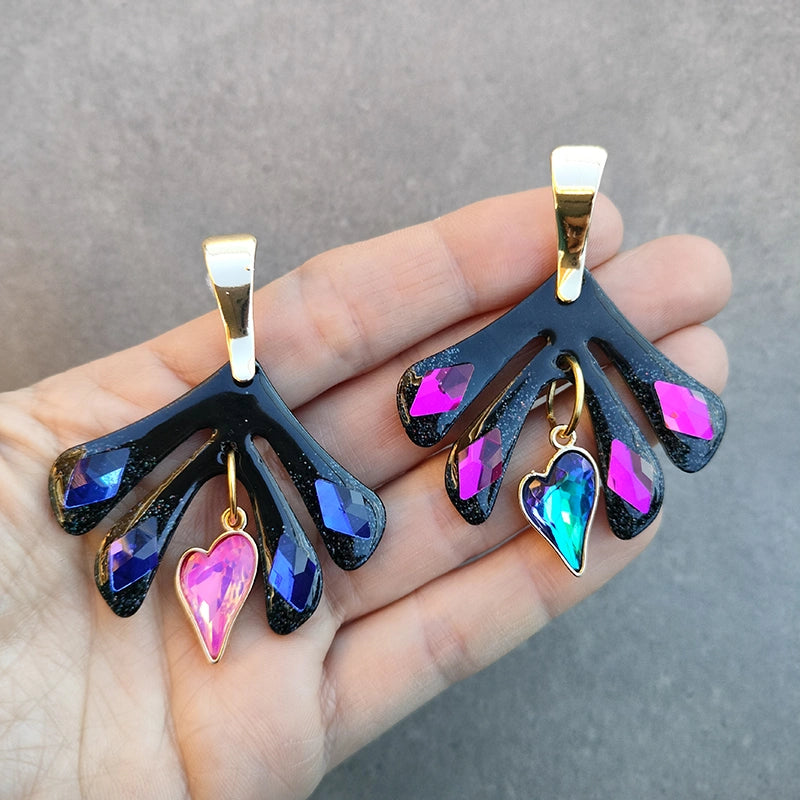 Pendientes de acero inoxidable dorado, resina, glitter y cristal. Perno de acero inoxidable (hipoalergénico).