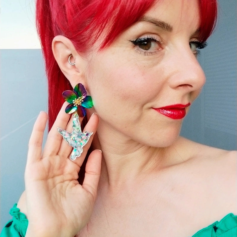 Pendientes de aleación y resina holográfica con strass. Perno de aleación.