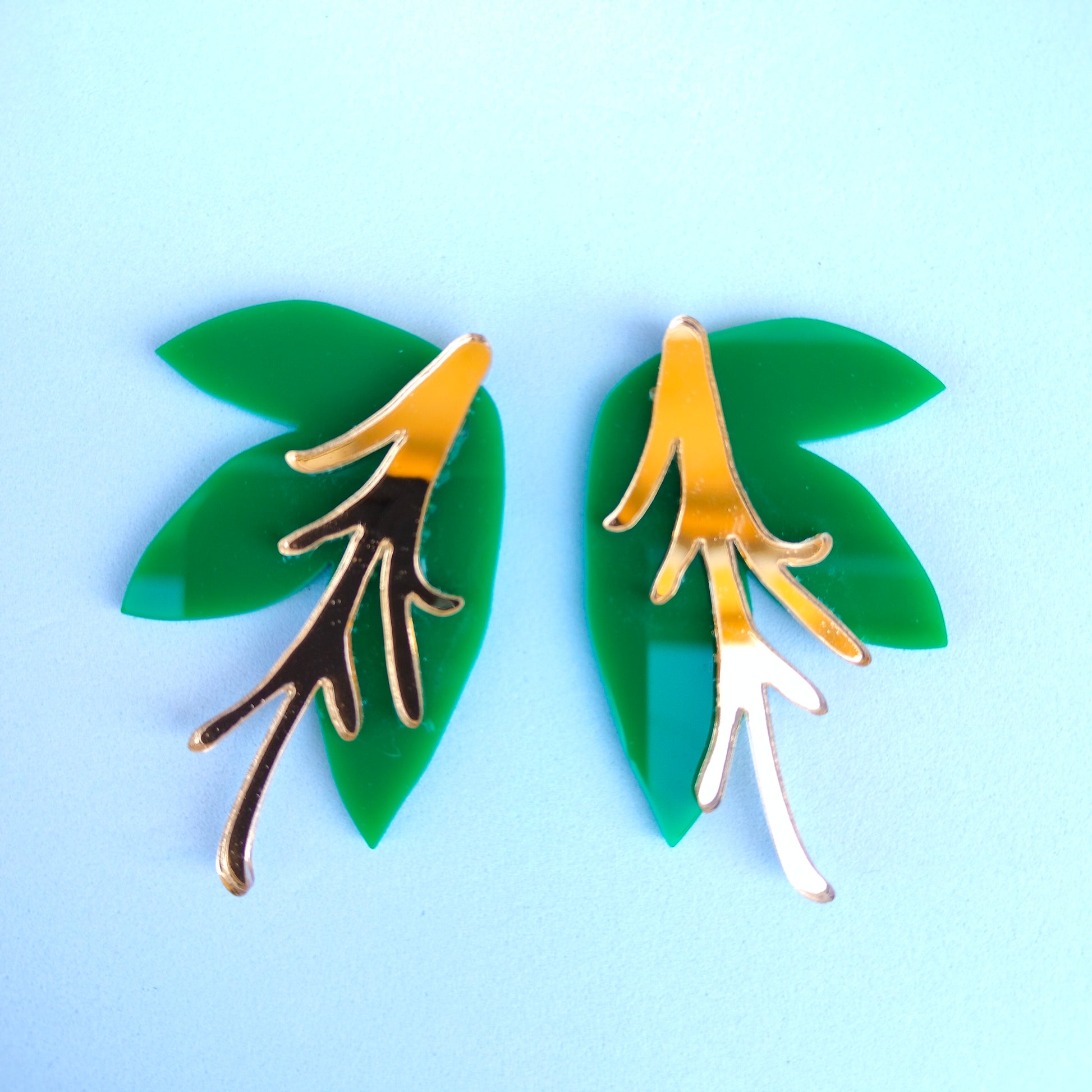 Pendientes de plexy y plexy cristal dorado. Perno de acero inoxidable (hipoalergénico).