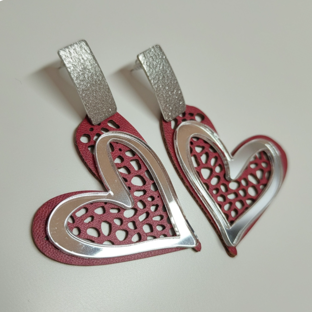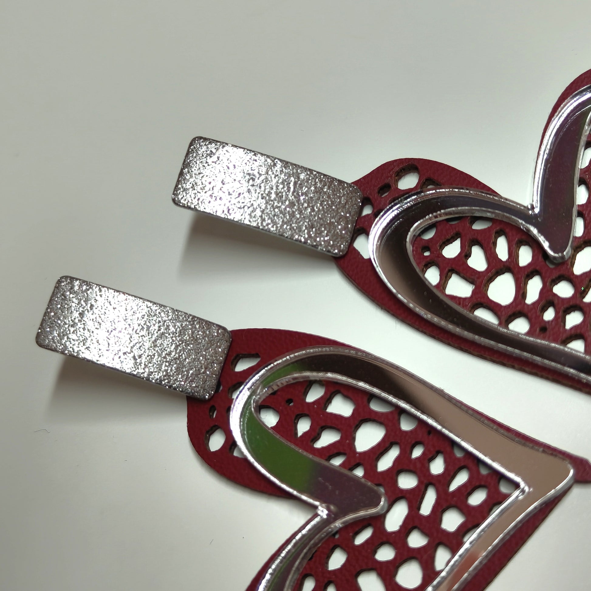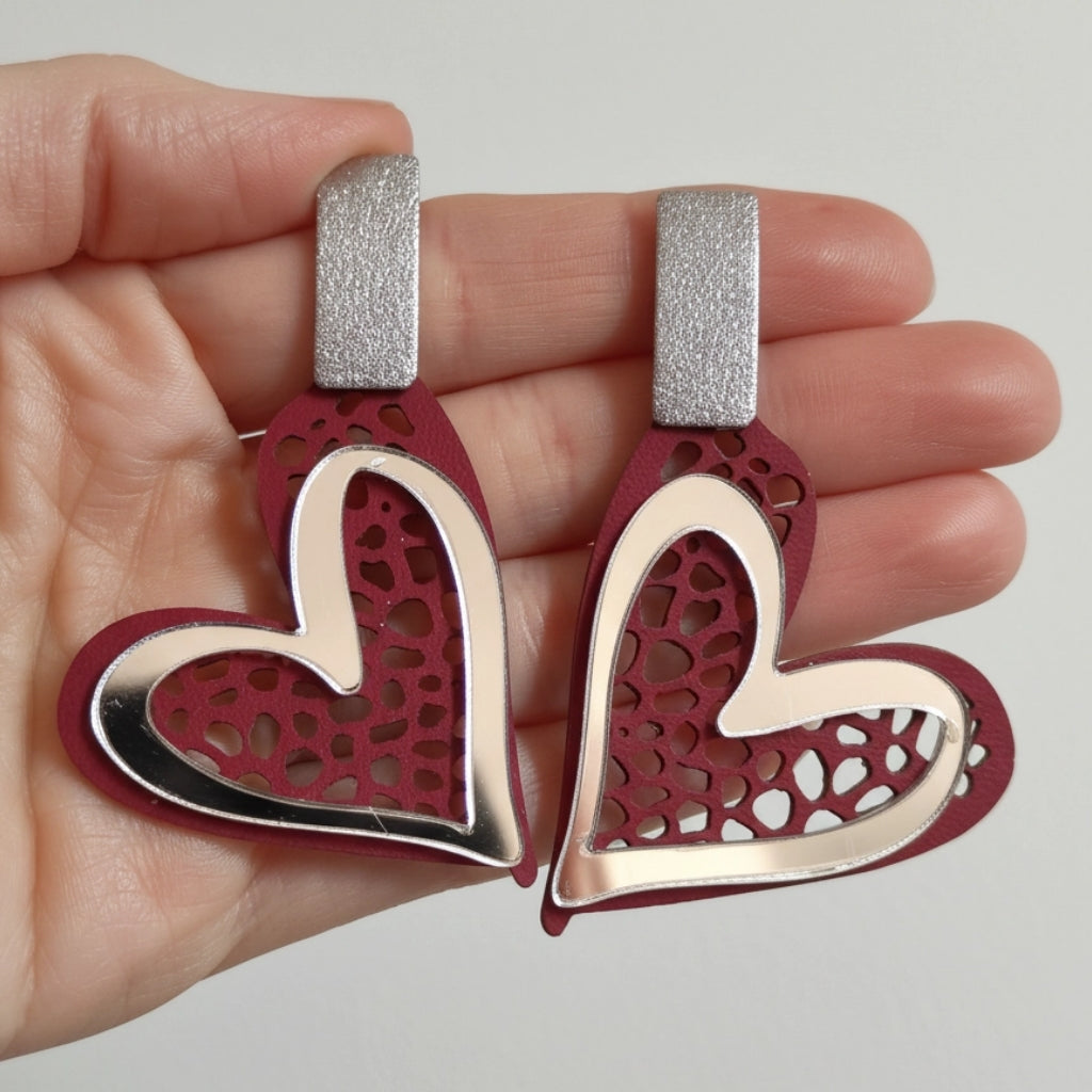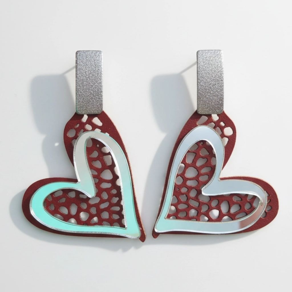 Materiales: acero inoxidable plata, polipiel, plexy espejo plata. Perno de acero inoxidable (hipoalergénico).