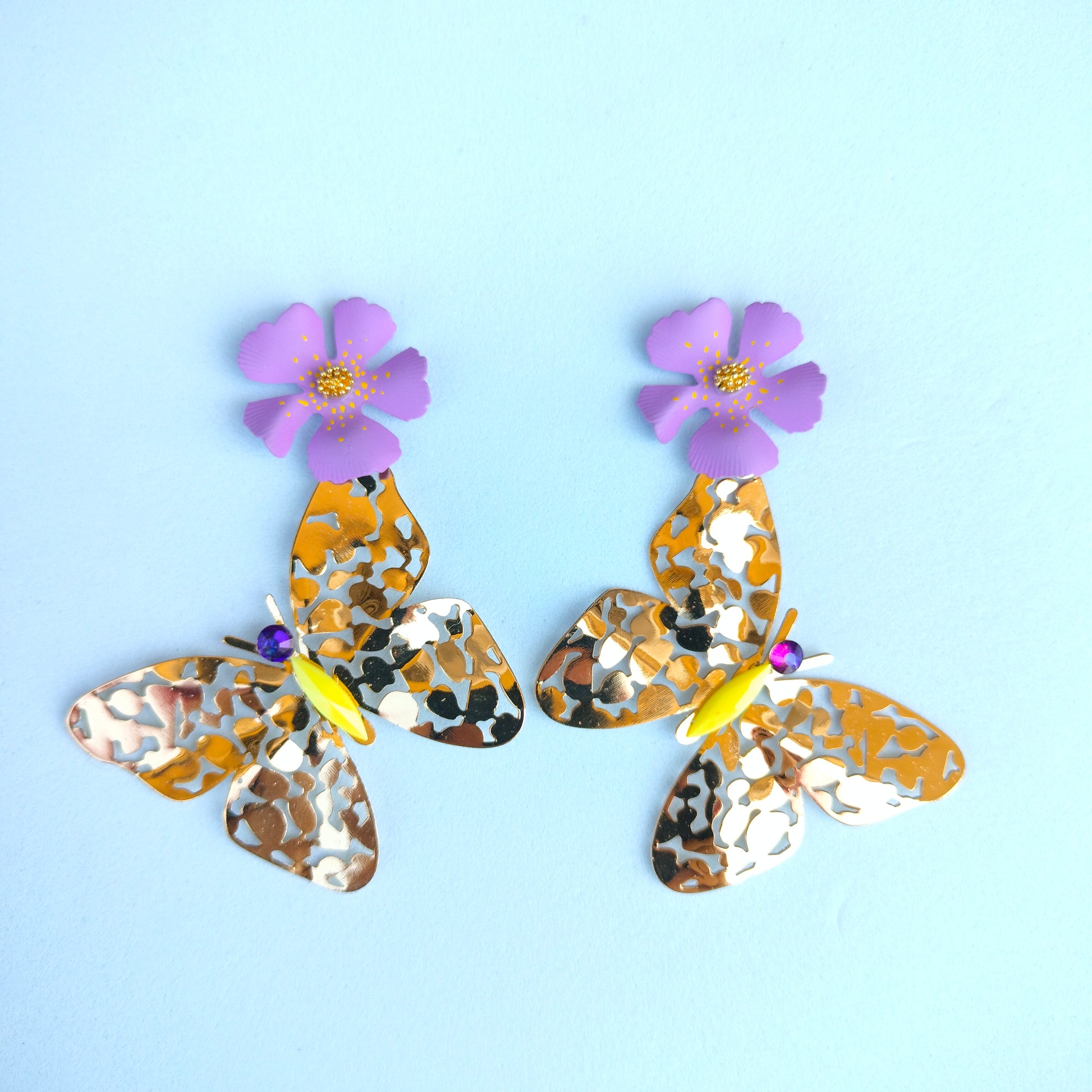 Pendientes de aleación de zinc esmaltado, acero inoxidable, plexy y strass. Perno de aleación de zinc.