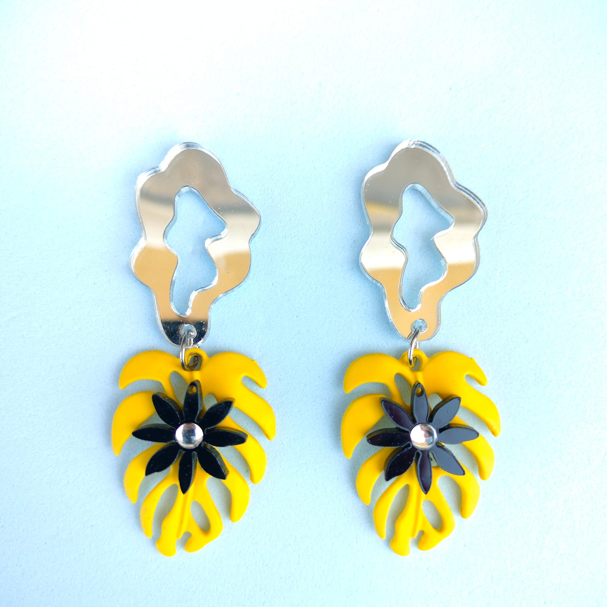 Pendientes de plexy espejo, aleación de zinc, plexy y strass. Perno de acero inoxidable (hipoalergénico).
